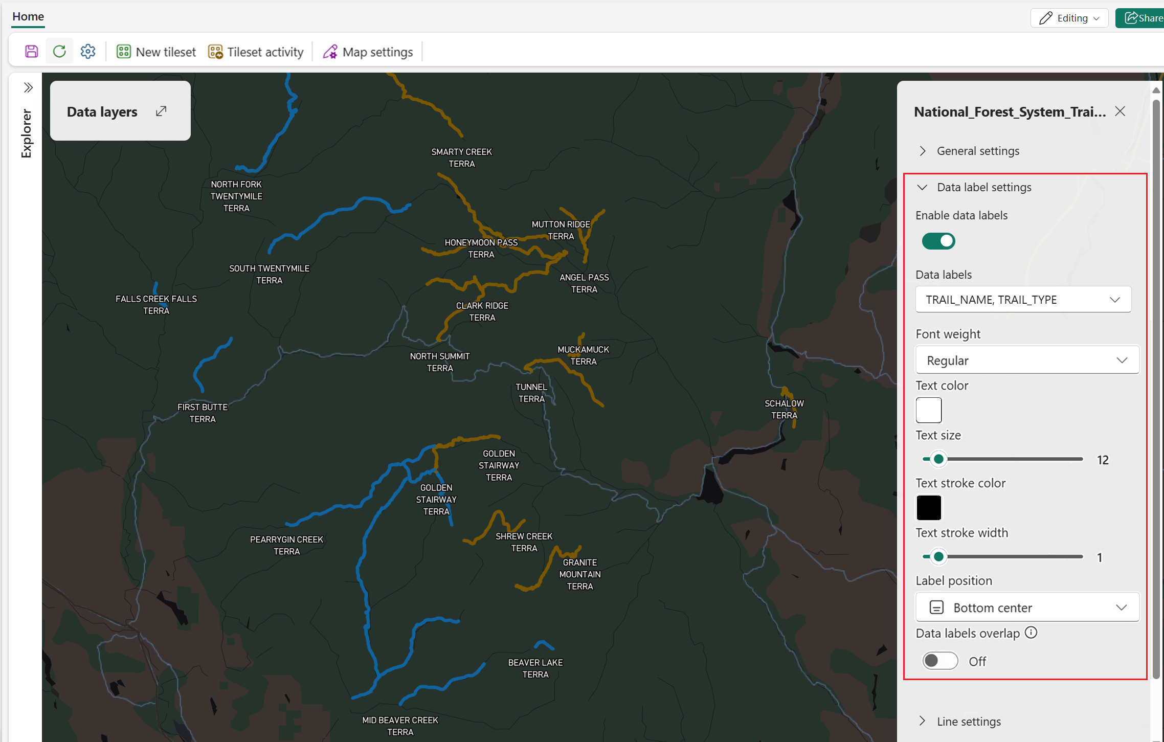 This example uses line geometry to display National Forest System trails, with data labels indicating trail name: