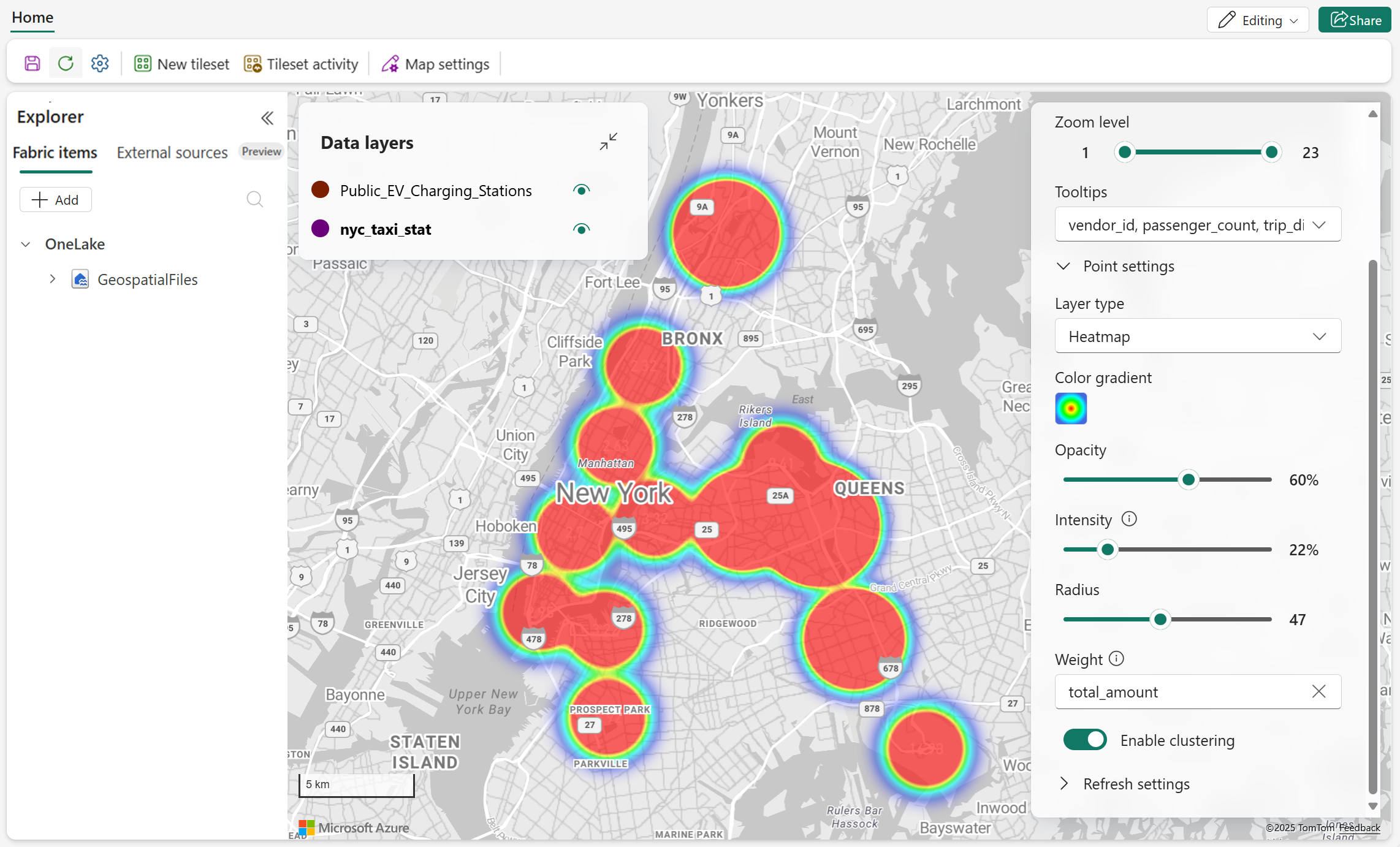 The following screenshot displays taxi pick-up location statistics in New York City. Enabling clustering based on the average trip distance can provide aggregated insights into which areas typically generate longer trips.