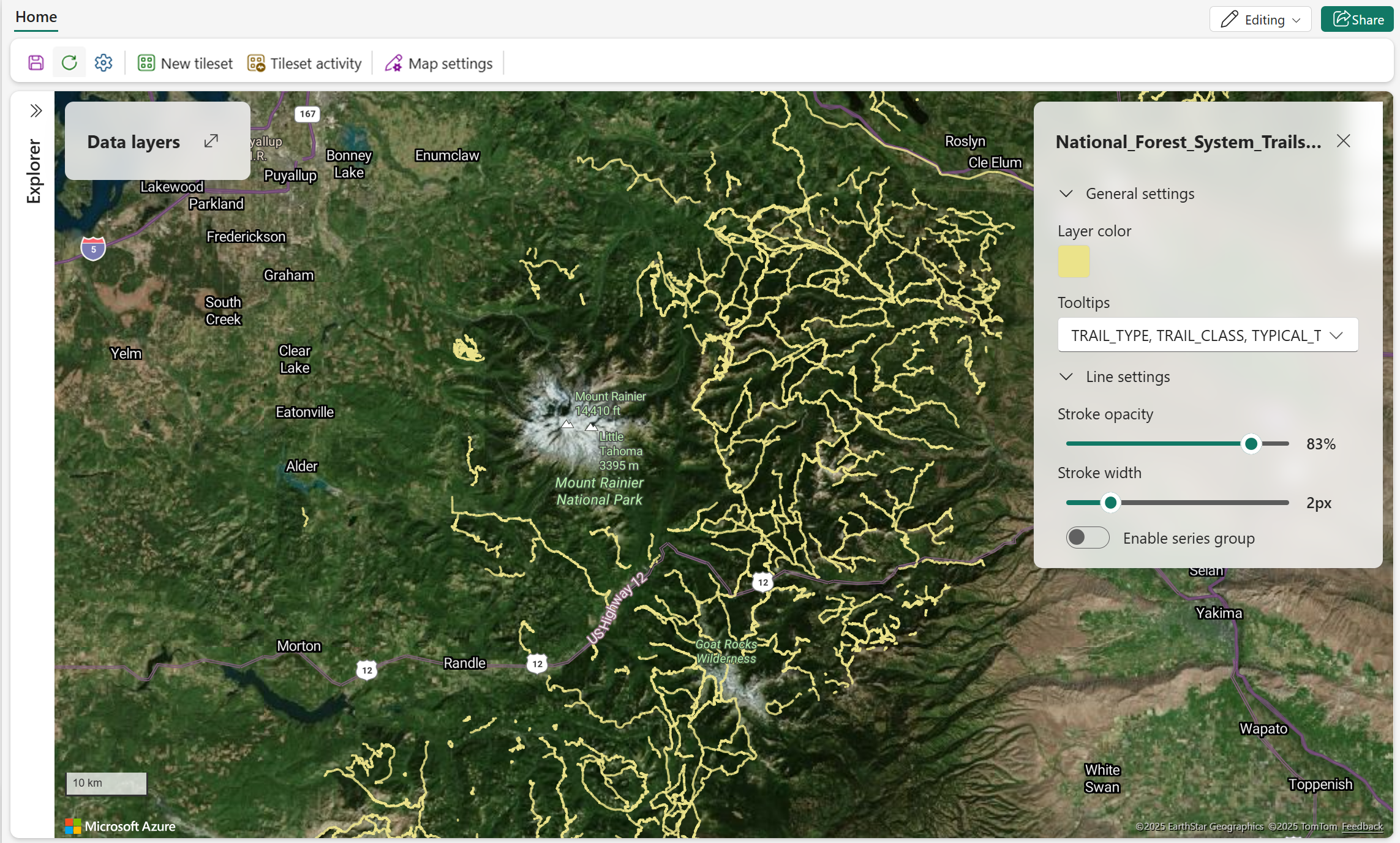 The following screenshot shows national forest trails near Mount Rainier.