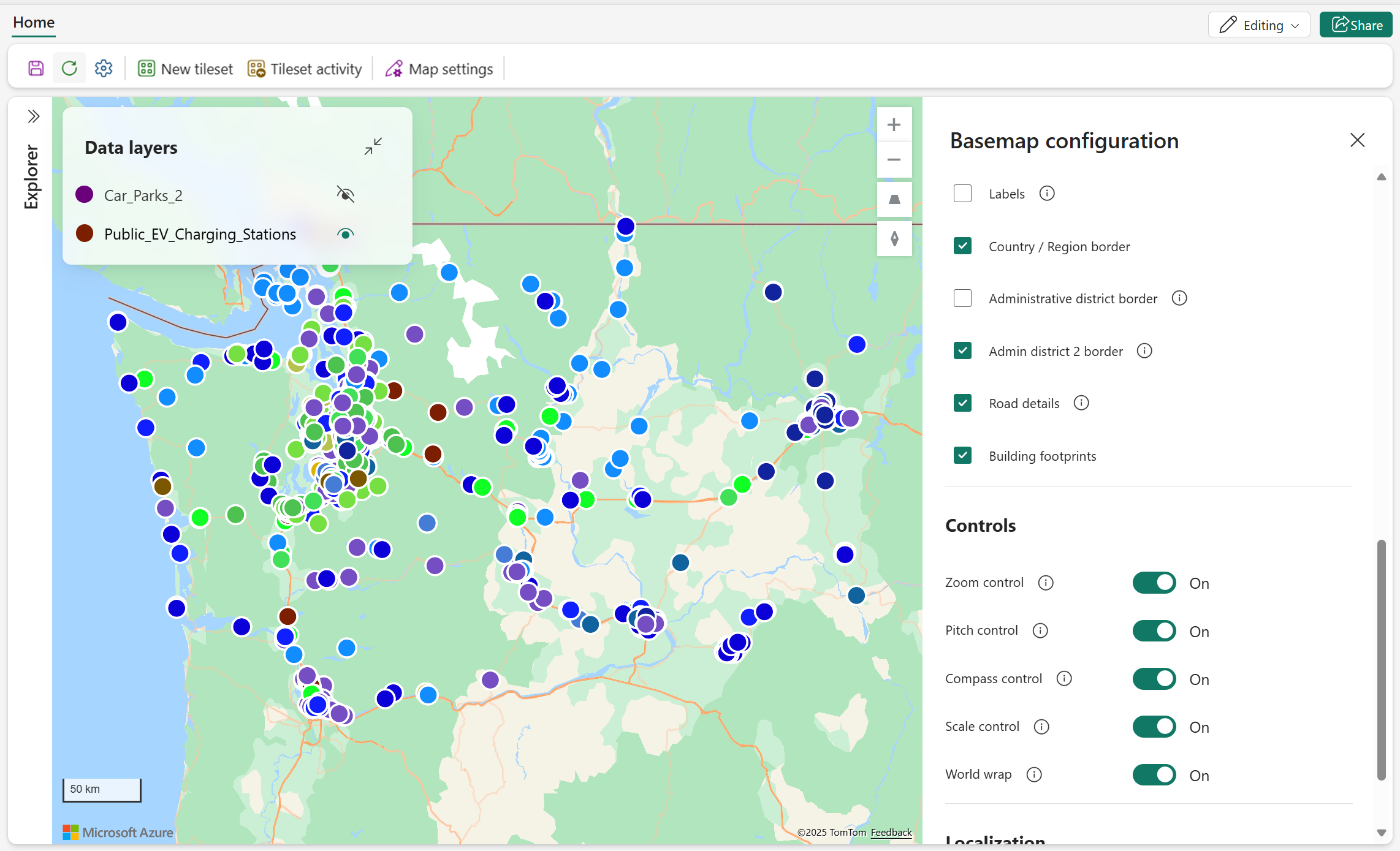 Microsoft Fabric Maps offers a comprehensive set of options for customizing the map and display. By default, the map style is set to Grayscale Light, but you can easily change the map style, and toggle the visibility of various map elements. More customization options include adding interactive controls, setting the initial map view, and selecting a display language that best suits the needs of the map's audience.