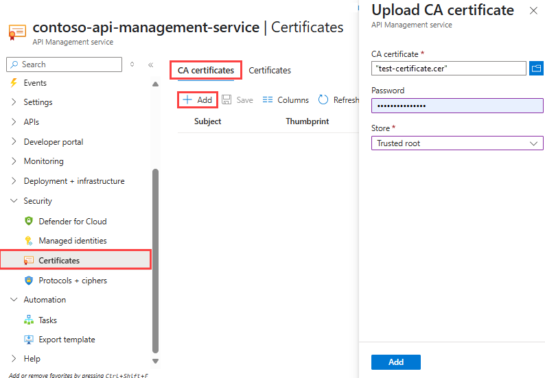 En el menú izquierdo, en Seguridad, seleccione Certificados. En la página Certificados, seleccione certificados de CA>+ Agregar.