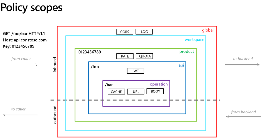API Management le permite definir directivas en los ámbitos siguientes, que se presentan aquí de más amplia a más estrecha: