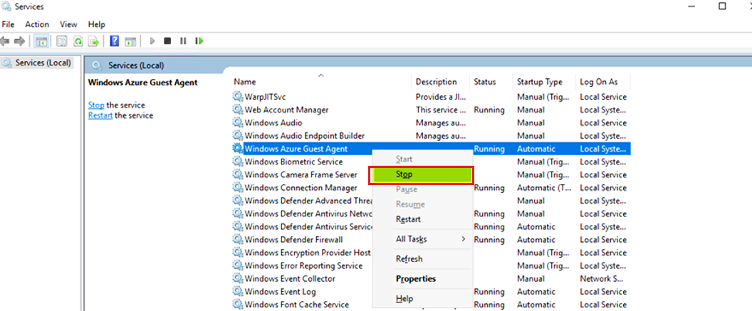 En la ventana Servicios, detenga el servicio agente invitado de Windows Azure .