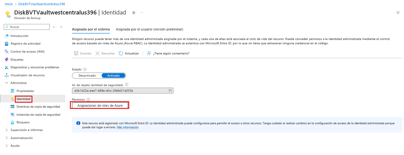 Asigne el rol Lector de copias de seguridad de disco a la identidad administrada del almacén de Backup en el disco de origen del que se tiene que realizar la copia de seguridad.