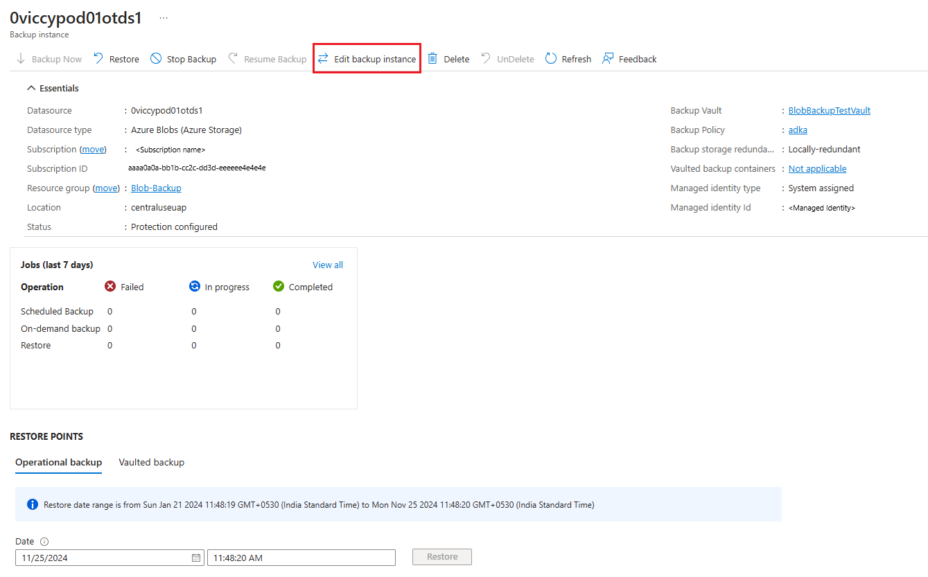 En la hoja Instancia de copia de seguridad, seleccione la instancia de copia de seguridad para la que desea cambiar la directiva de copia de seguridad y, a continuación, seleccione Editar instancia de copia de seguridad.