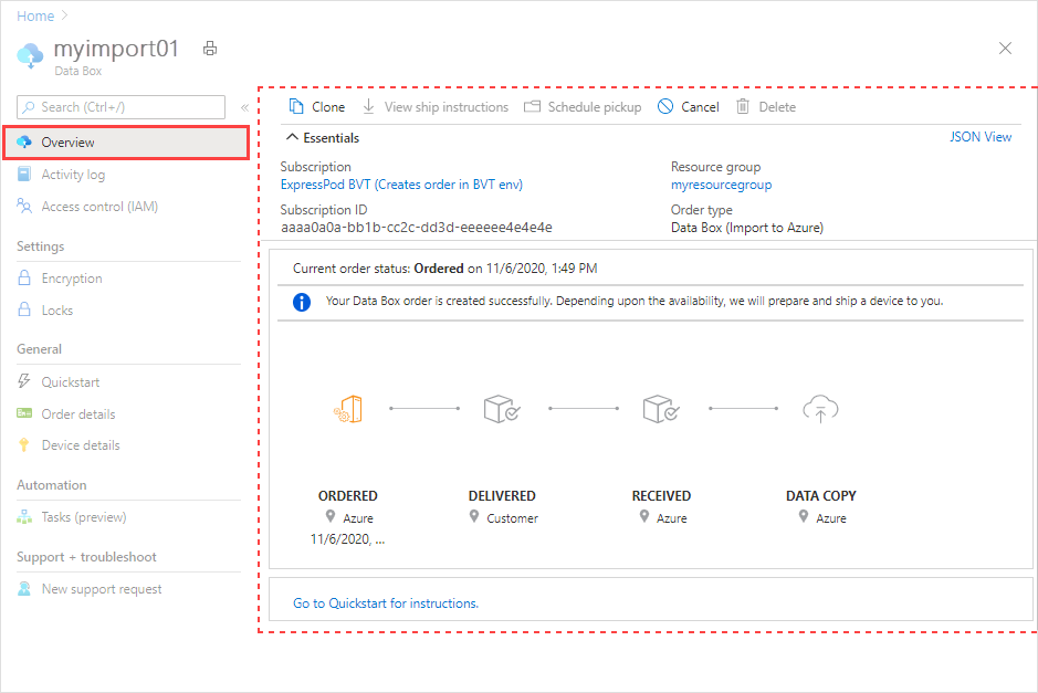 Vaya a la página Información general de un pedido de Data Box.