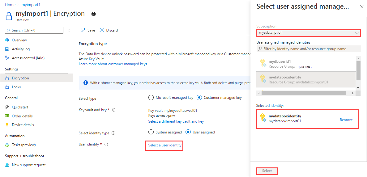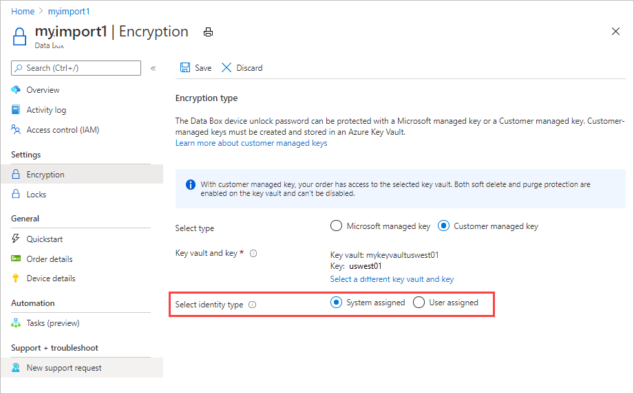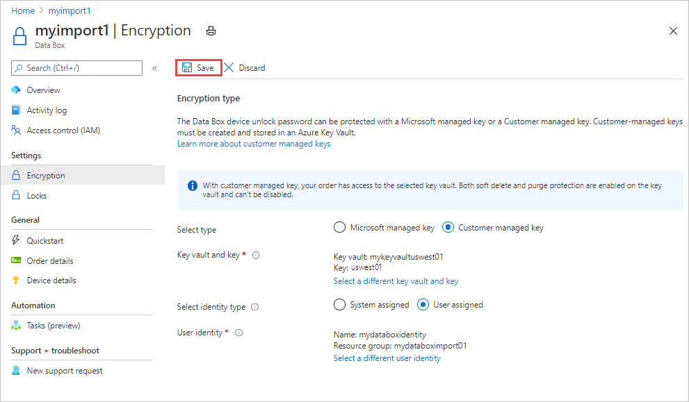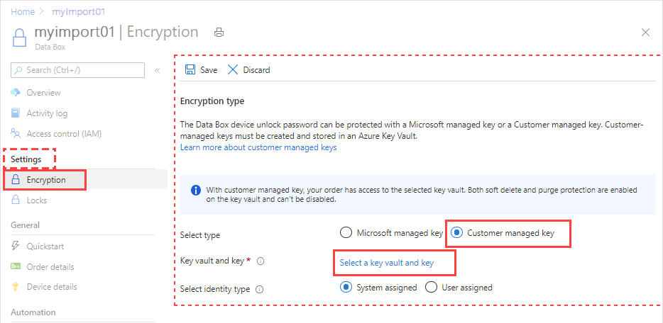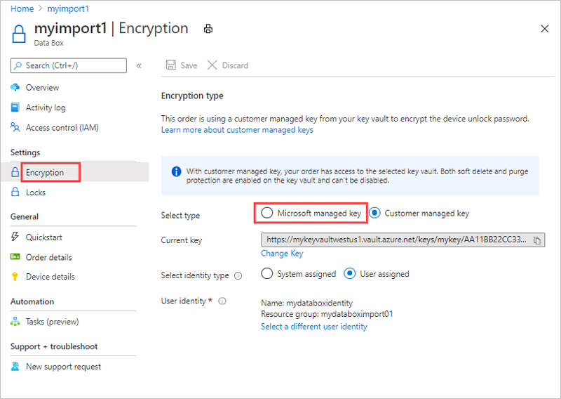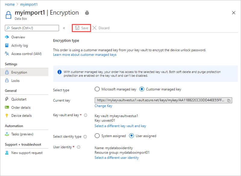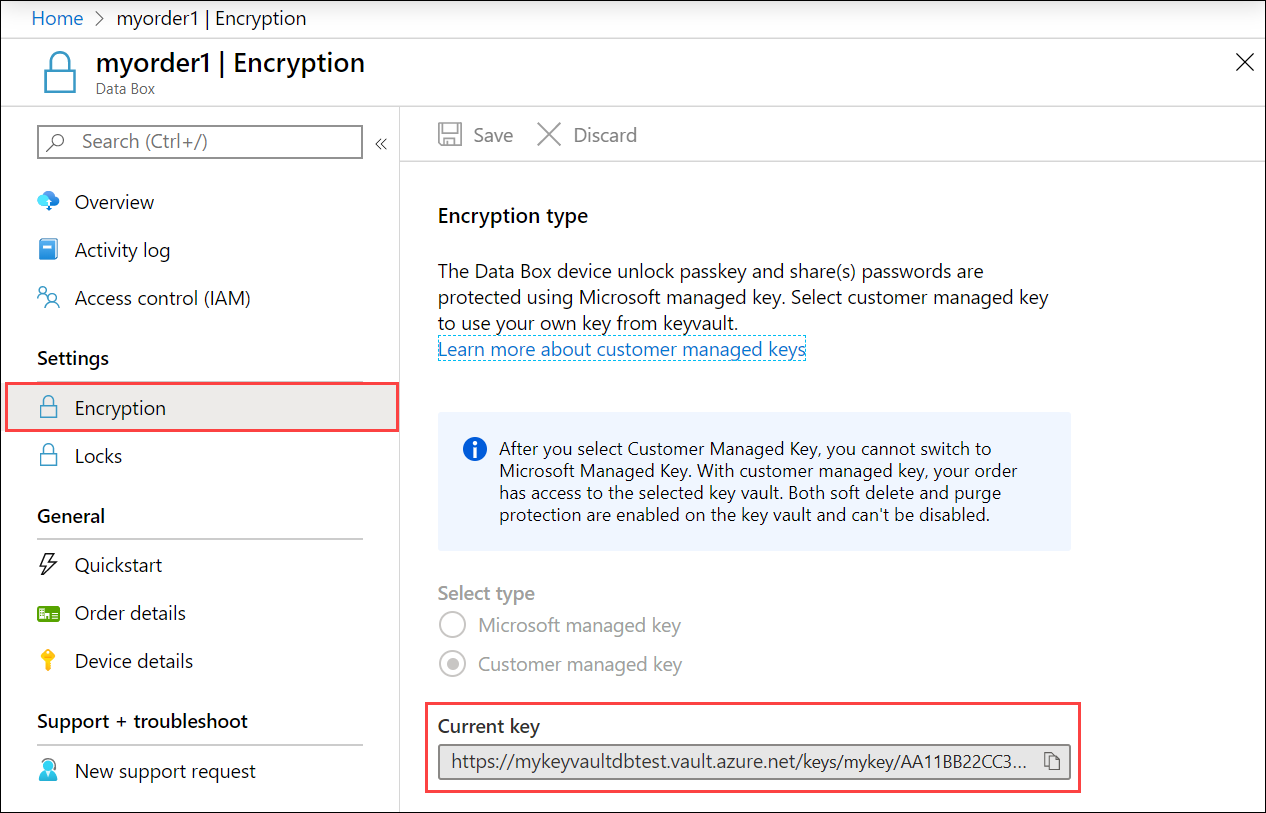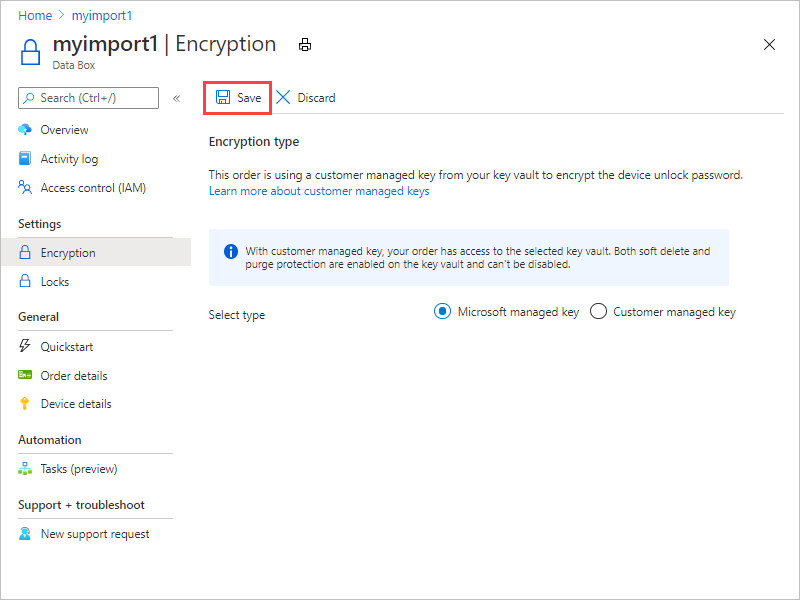 Para mantener este nivel de control a lo largo del proceso de pedido, use una clave administrada por el cliente cuando lo cree. Para más información, consulte Tutorial: Realización de pedidos de Azure Data Box.