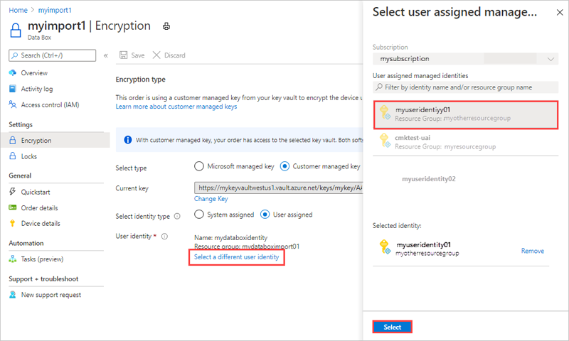 En la pantalla Información general del pedido de Data Box, vaya a Configuración>Cifrado y seleccione Cambiar clave.