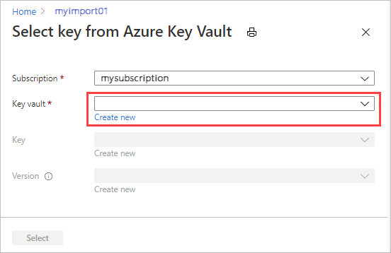 Se abre la página Seleccionar clave de Azure Key Vault y la suscripción se rellena automáticamente en la lista desplegable. Seleccione un almacén de claves existente en la lista desplegable Almacén de claves o seleccione Crear nuevo para crear un nuevo almacén de claves.
