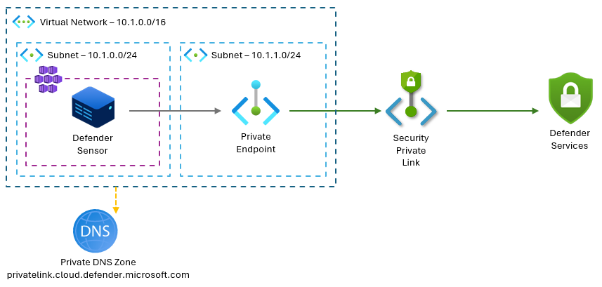Microsoft Security Private Link permite que las cargas de trabajo de la red virtual se conecten a Microsoft Defender for Cloud. Para habilitar esta conexión, cree un recurso de Security Private Link en su suscripción y puntos de conexión privados en las redes virtuales de Azure que se conecten a ella.