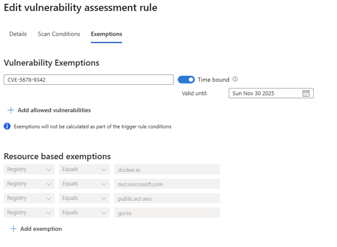 Configura exenciones durante la creación de reglas. Se aplican a las reglas de auditoría y denegación.