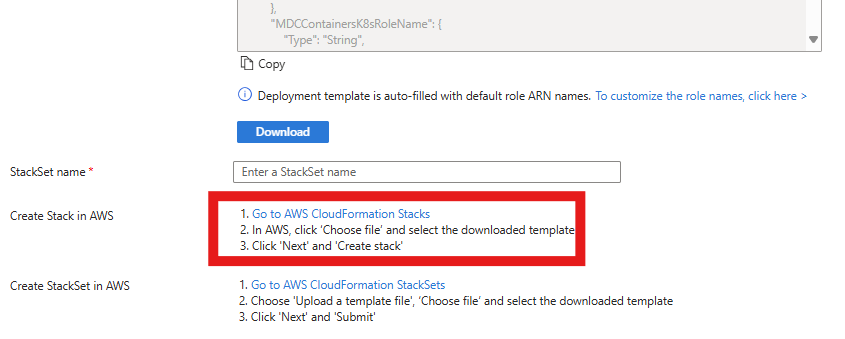 Siga los pasos descritos en Conexión de cuentas de AWS a Microsoft Defender for Cloud hasta el paso 8 de la sección Conexión de la cuenta de AWS .