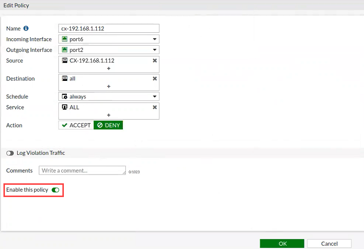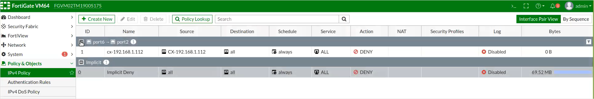 La directiva de bloqueo se crea automáticamente y aparece en la ventana de la directiva IPv4 de FortiGate.