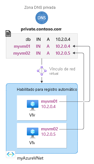 En el ejemplo siguiente se crea una red virtual denominada myAzureVNet. Luego, se crea una zona DNS denominada private.contoso.com en el grupo de recursos MyAzureResourceGroup, se vincula esa zona DNS a la red virtual MyAzureVnet y se habilita el registro automático.