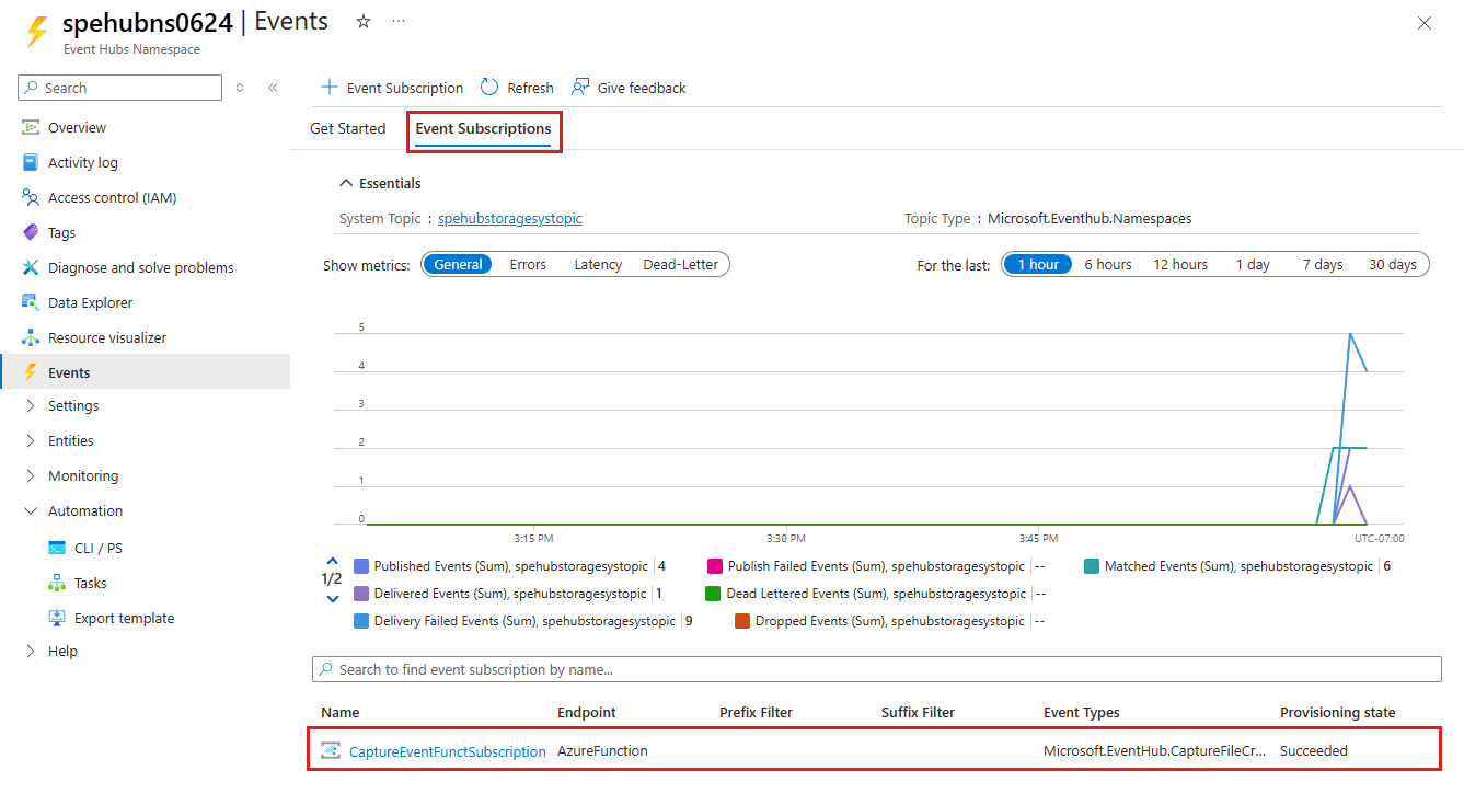Compruebe que se haya creado la suscripción a eventos. Cambie a la pestaña Suscripciones a eventos de la página Eventos del espacio de nombres de Event Hubs.