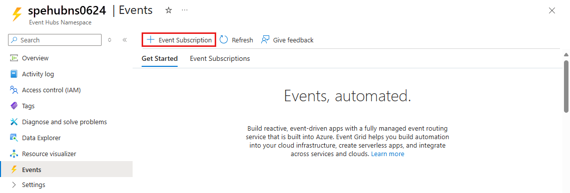 En la página Espacio de nombres de Event Hubs, seleccione Eventos y, a continuación, seleccione + Suscripción de eventos en la barra de herramientas.