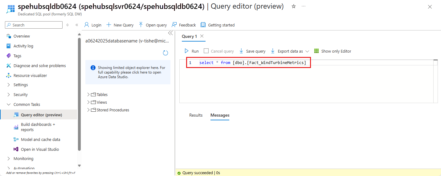 En la pestaña del explorador donde tiene abierta la ventana de consulta, consulte la tabla del grupo de SQL dedicado para obtener los datos migrados.