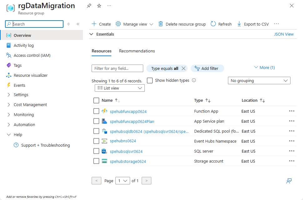 az deployment group create \ --resource-group rgDataMigration \ --template-uri https://raw.githubusercontent.com/Azure/azure-docs-json-samples/master/event-grid/EventHubsDataMigration.json \ --parameters eventHubNamespaceName=<event-hub-namespace> eventHubName=hubdatamigration sqlServerName=<sql-server-name> sqlServerUserName=<user-name> sqlServerPassword=<password> sqlServerDatabaseName=<database-name> storageName=<unique-storage-name> functionAppName=<app-name>Presione Entrar en la ventana de Cloud Shell para ejecutar el comando. Este proceso puede tardar un poco debido a que se están creando varios recursos. En el resultado del comando, asegúrese de que no haya errores.