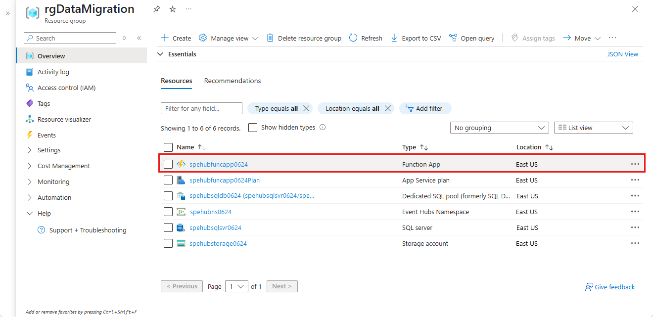 En la página Grupo de recursos , seleccione la aplicación Azure Functions.