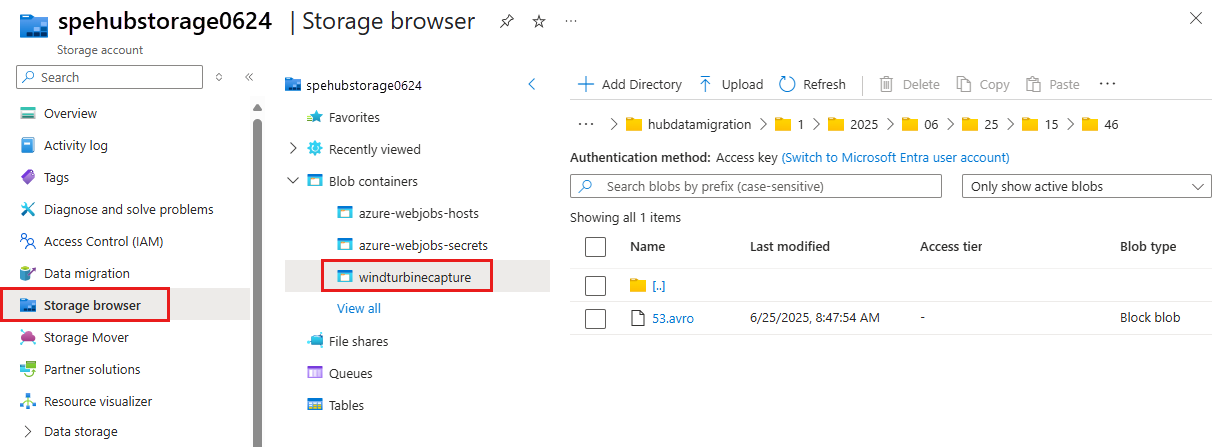 fileUrldel objetodataapunta al blob en el almacenamiento. La aplicación de función usa esta dirección URL para recuperar el archivo de blob con los datos capturados.{ "topic": "/subscriptions/<AZURE SUBSCRIPTION ID>/resourcegroups/rgDataMigration/providers/Microsoft.EventHub/namespaces/spehubns1207", "subject": "hubdatamigration", "eventType": "Microsoft.EventHub.CaptureFileCreated", "id": "4538f1a5-02d8-4b40-9f20-36301ac976ba", "data": { "fileUrl": "https://spehubstorage1207.blob.core.windows.net/windturbinecapture/spehubns1207/hubdatamigration/0/2020/12/07/21/49/12.avro", "fileType": "AzureBlockBlob", "partitionId": "0", "sizeInBytes": 473444, "eventCount": 2800, "firstSequenceNumber": 55500, "lastSequenceNumber": 58299, "firstEnqueueTime": "2020-12-07T21:49:12.556Z", "lastEnqueueTime": "2020-12-07T21:50:11.534Z" }, "dataVersion": "1", "metadataVersion": "1", "eventTime": "2020-12-07T21:50:12.7065524Z" }