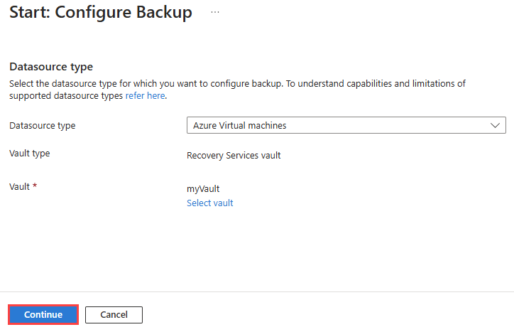 Configuración Valor Tipo de origen de datos Tipo de origen de datos Seleccione Máquinas virtuales de Azure. Almacén Seleccione myVault. Usará este almacén de Recovery Services para almacenar las copias de seguridad de la máquina virtual. Seleccione Continuar.
