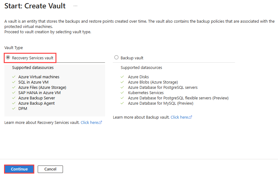 En la página Inicio: Crear almacén, seleccione Almacén de Recovery Services y, a continuación, seleccione Continuar.