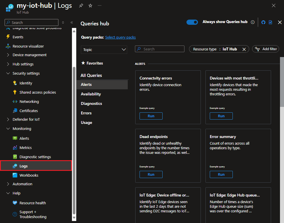 Para realizar el análisis de registros, vaya a Azure Portal, abra el centro de IoT y, a continuación, seleccione Registros en Supervisión. De manera predeterminada, estas consultas de Log Analytics tienen como ámbito los registros y las métricas recopilados en los registros de Azure Monitor para el centro de IoT.