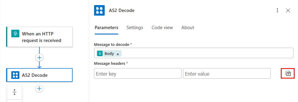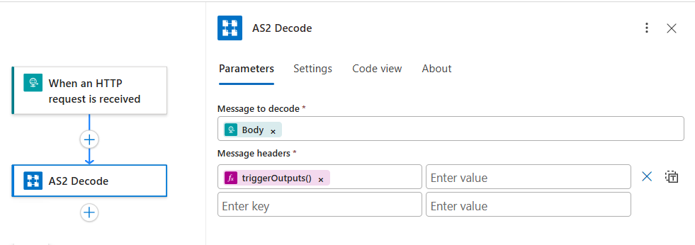 - Descodifique el contenido del mensaje entrante con la acción de descodificación AS2 (v2) y la acción de descodificación X12 .