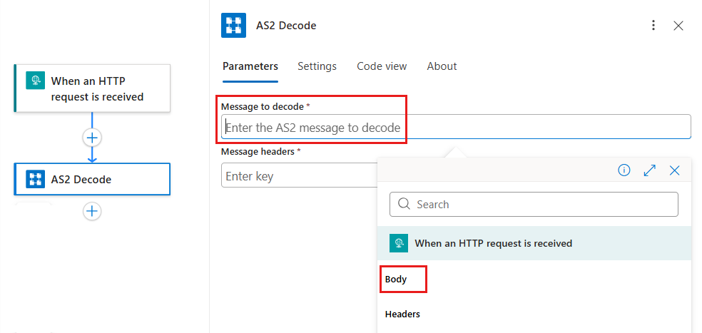 @body('Decode_AS2')?['outgoingMdnContent']?['outgoingMdnHeaders']En el parámetro Body de la acción, escriba la siguiente expresión: