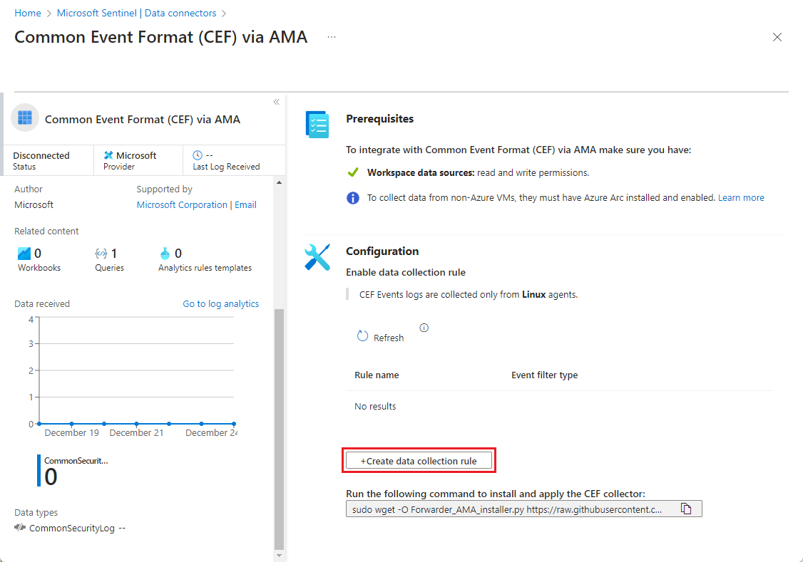 Identifique qué conector de datos requiere la solución de Microsoft Sentinel Syslog a través de AMA o Common Event Format (CEF) a través de AMA y si necesita instalar la solución Syslog o Common Event Format. Para cumplir este requisito previo: