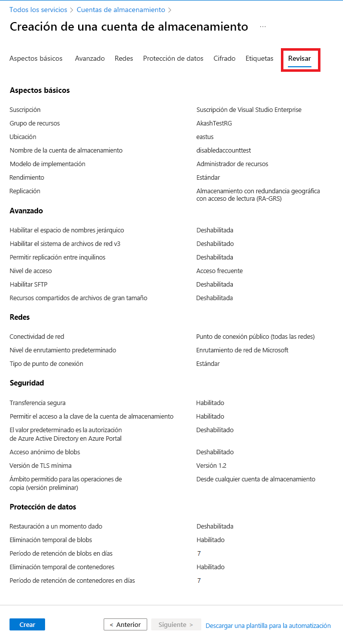 En la imagen siguiente se muestran los datos de la pestaña Revisar antes de la creación de una nueva cuenta de almacenamiento.