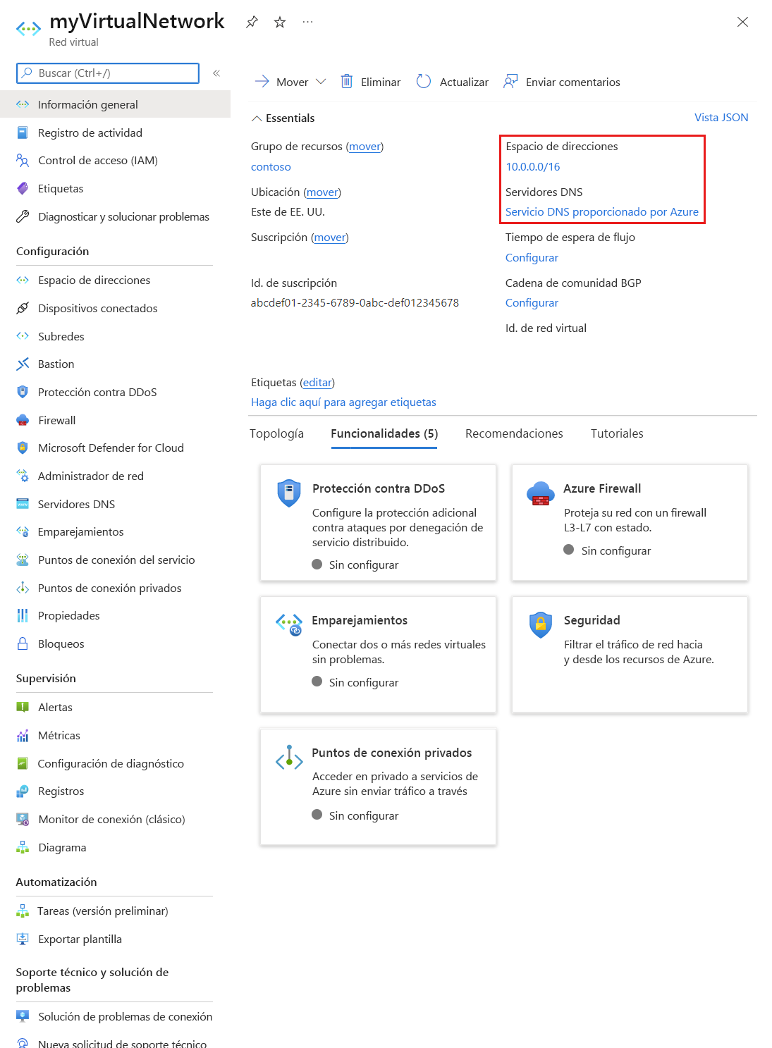Propiedades: muestra la configuración de la red virtual, incluidos el identificador de recurso de la red virtual y la suscripción de Azure.