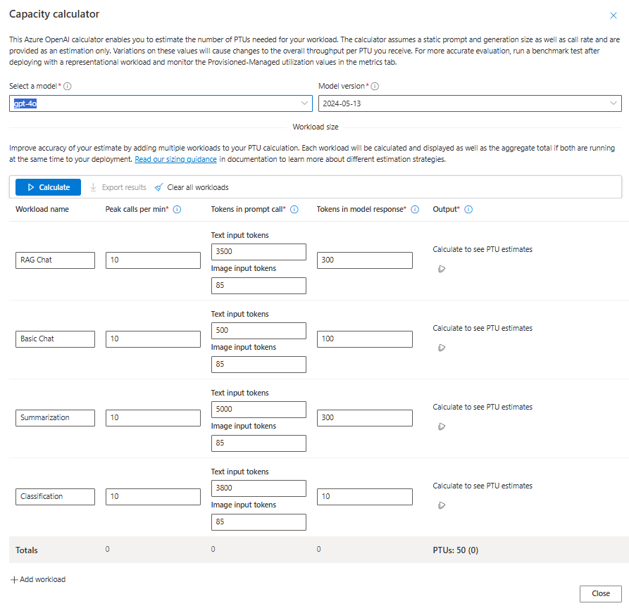 Las PTU representan una cantidad de capacidad de procesamiento de modelos. Al igual que ocurre con el equipo o las bases de datos, las diferentes cargas de trabajo o solicitudes al modelo consumirán diferentes cantidades de capacidad de procesamiento subyacente. La conversión de las necesidades de rendimiento a las PTU se puede aproximar mediante datos históricos de uso de tokens o estimaciones de formas de llamada (tokens de entrada, tokens de salida y solicitudes por minuto), como se describe en la documentación de rendimiento y latencia .
