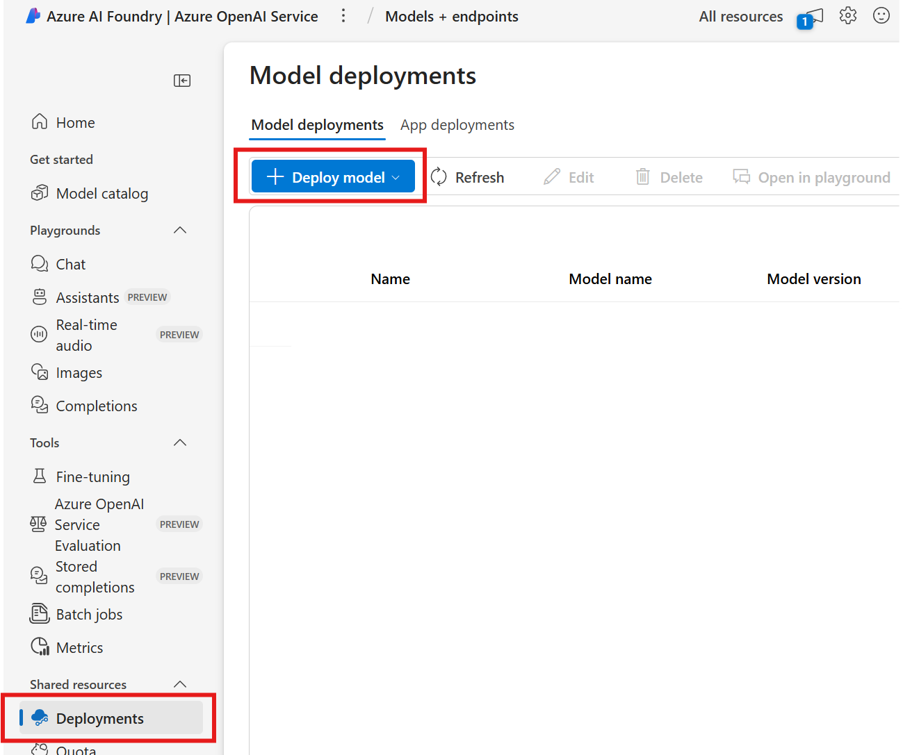 Para usar capacity planner, vaya al portal de Foundry y seleccione el botón Implementaciones . A continuación, seleccione Implementar modelo.