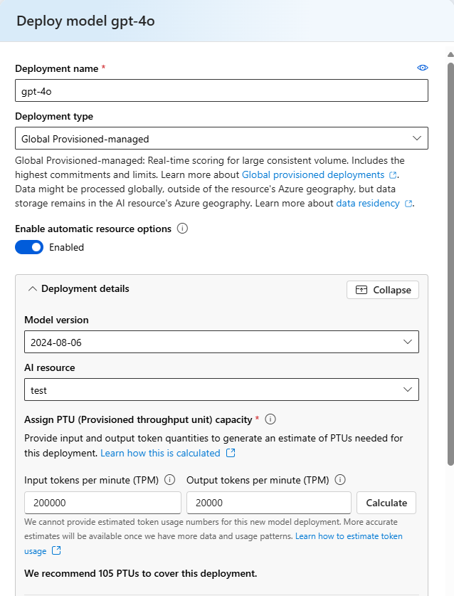 Para obtener una estimación rápida de la carga de trabajo mediante TPM de entrada y salida, aproveche el planificador de capacidad integrado en la sección de detalles de implementación de la pantalla de diálogo de implementación. El planificador de capacidad integrado forma parte del flujo de trabajo de implementación para ayudar a simplificar el dimensionamiento y la asignación de cuota a una implementación de PTU para una carga de trabajo determinada. Para obtener más información sobre cómo identificar y calcular datos de TPM, revise las recomendaciones en nuestra documentación sobre rendimiento y latencia.