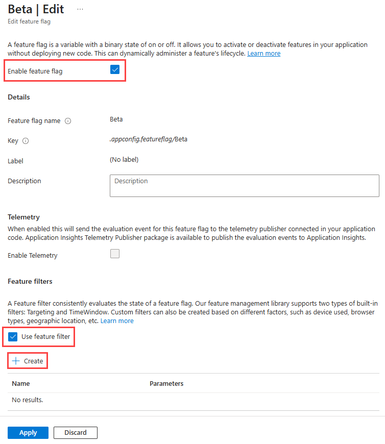 Cree una marca de característica denominada Beta en el almacén de App Configuration y ábrala para su edición. Para obtener más información sobre cómo agregar y editar una marca de característica, consulte Crear una marca de característica y Editar marcas de características.