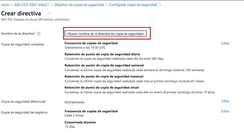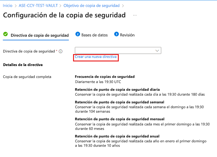 En Directiva de copia de seguridad, seleccione Crear una nueva directiva para las bases de datos.