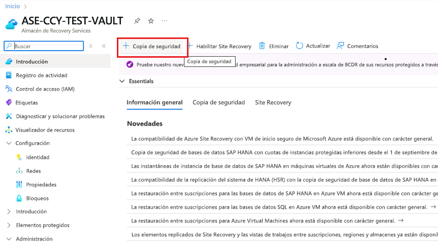 Vaya al almacén de Recovery Services y seleccione + Copia de seguridad.