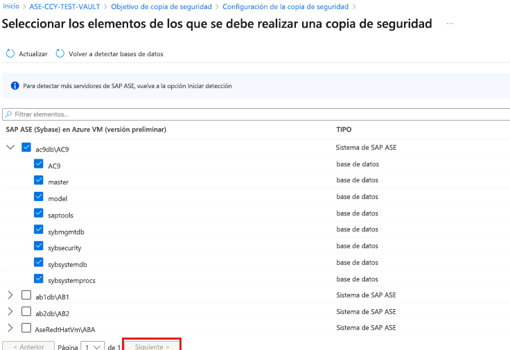 En Seleccionar elementos para copia de seguridad, seleccione las bases de datos para protección y luego Siguiente.