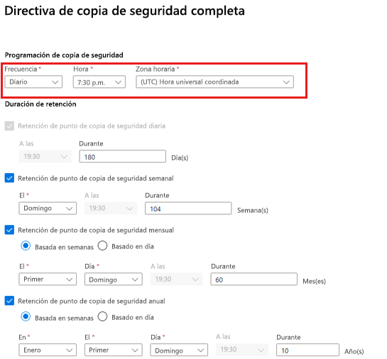 En el período de retención, defina el período de retención para la copia de seguridad completa.