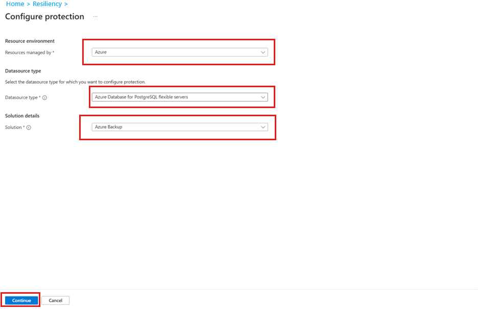 En el panel Configurar protección , seleccione Recurso administrado por como Azure, Tipo de origen de datos como servidores flexibles de Azure Database for PostgreSQL y Solución como Azure Backup y, a continuación, seleccione Continuar.