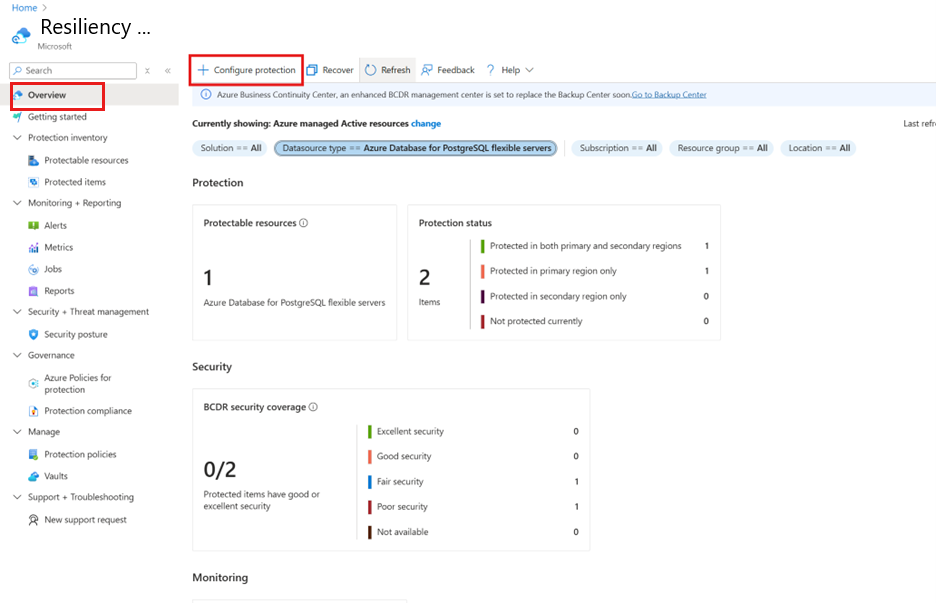 Vaya a Resistencia y, a continuación, seleccione Información general>+ Configurar protección.