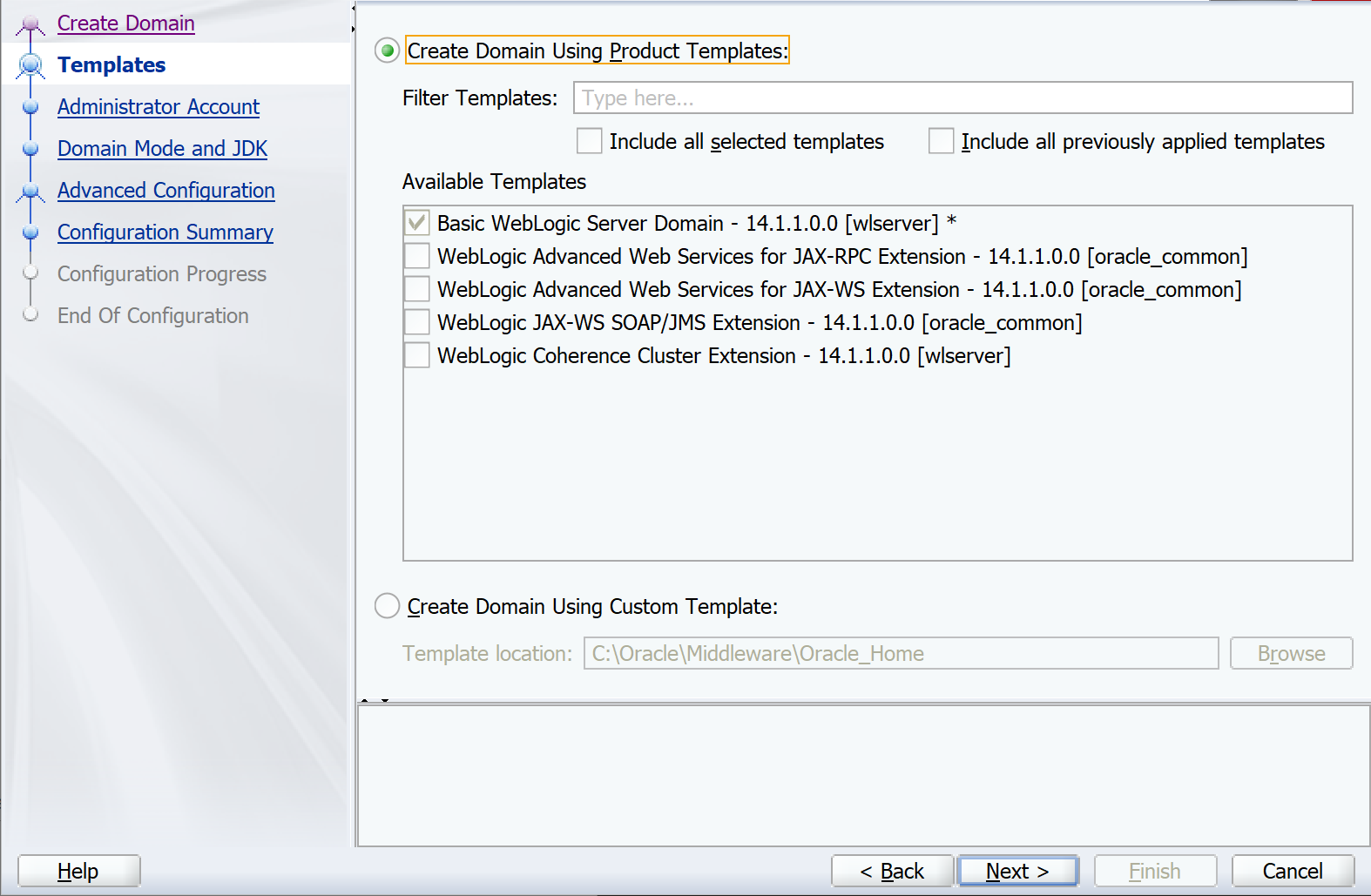 Windows - Asistente de configuración de Oracle - Modo de dominio y JDK.