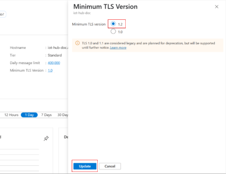En Administración -> Avanzado -> Seguridad de capa de transporte (TLS) -> Versión de TLS mínima, seleccione 1.2. Esta configuración solo aparece para los centros de IoT creados en la región admitida.