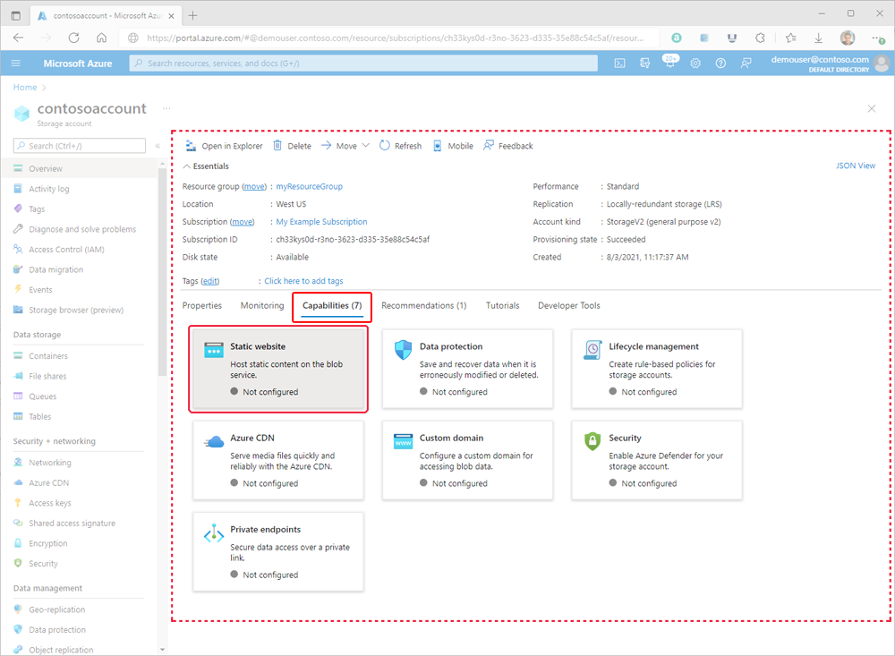El hospedaje de sitios web estáticos es una característica que tiene que habilitar en la cuenta de almacenamiento.