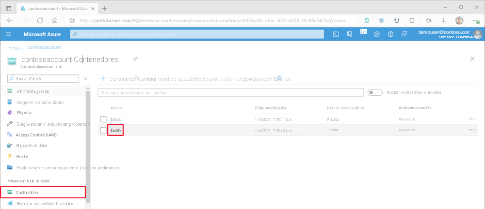 En Azure Portal, vaya a la cuenta de almacenamiento que contiene el sitio web estático. Seleccione Contenedores en el panel de navegación izquierdo para mostrar la lista de contenedores.