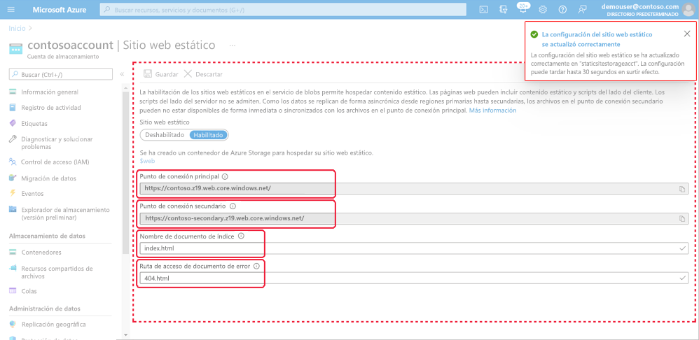 Seleccione Habilitado para habilitar el hospedaje de sitios web estáticos para la cuenta de almacenamiento.