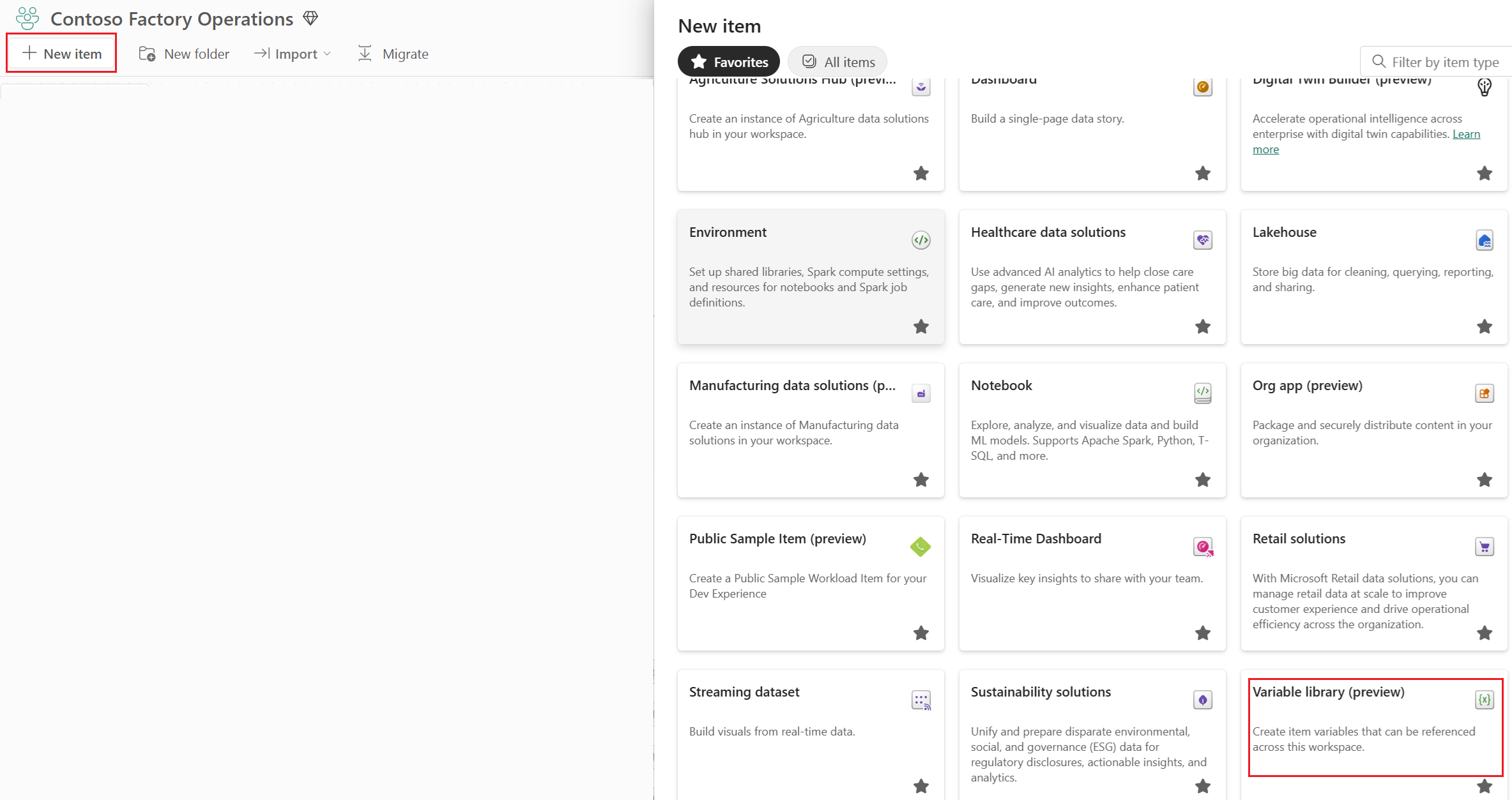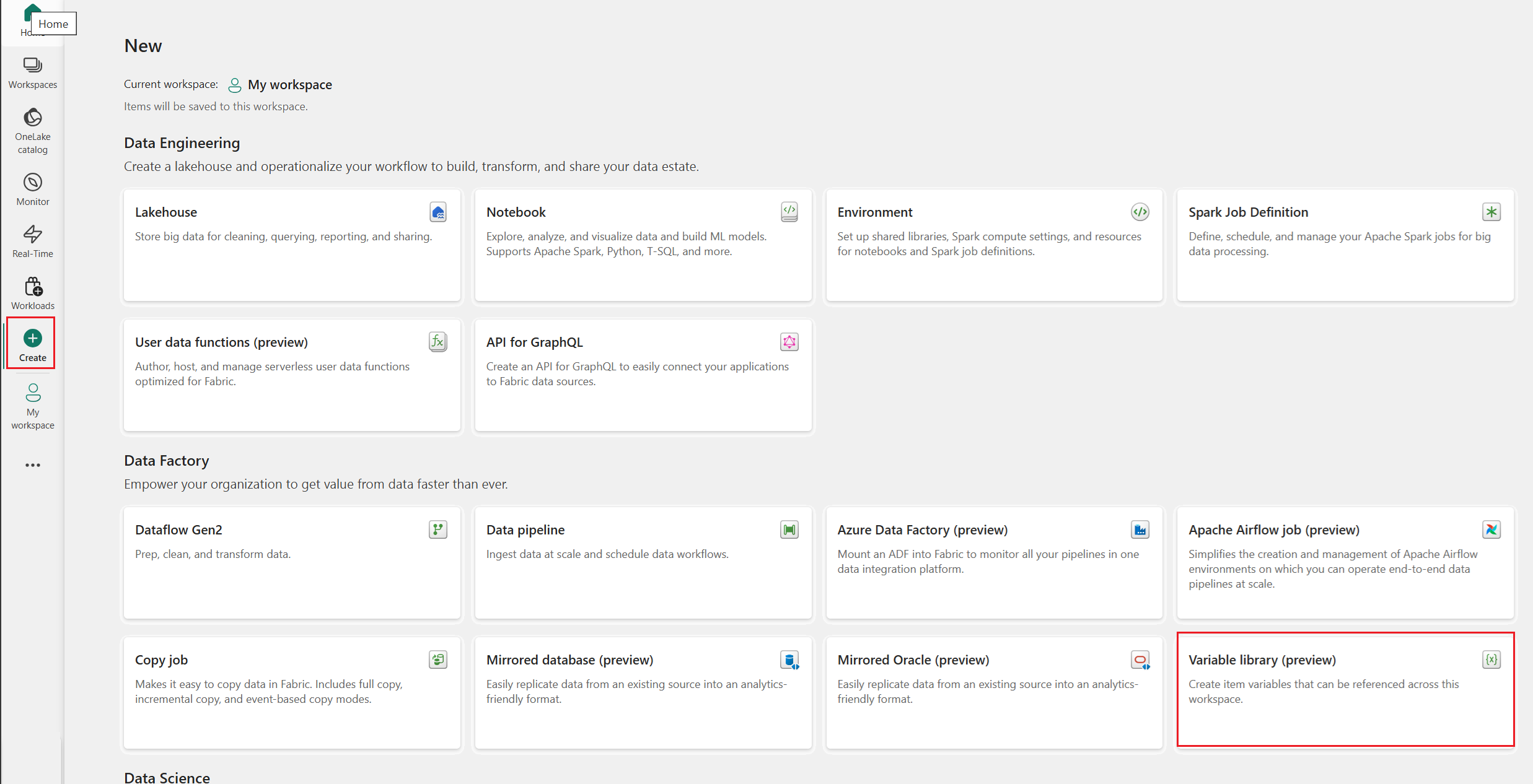 Puede crear un elemento de biblioteca de variables desde la página principal de Fabric o desde dentro del área de trabajo: