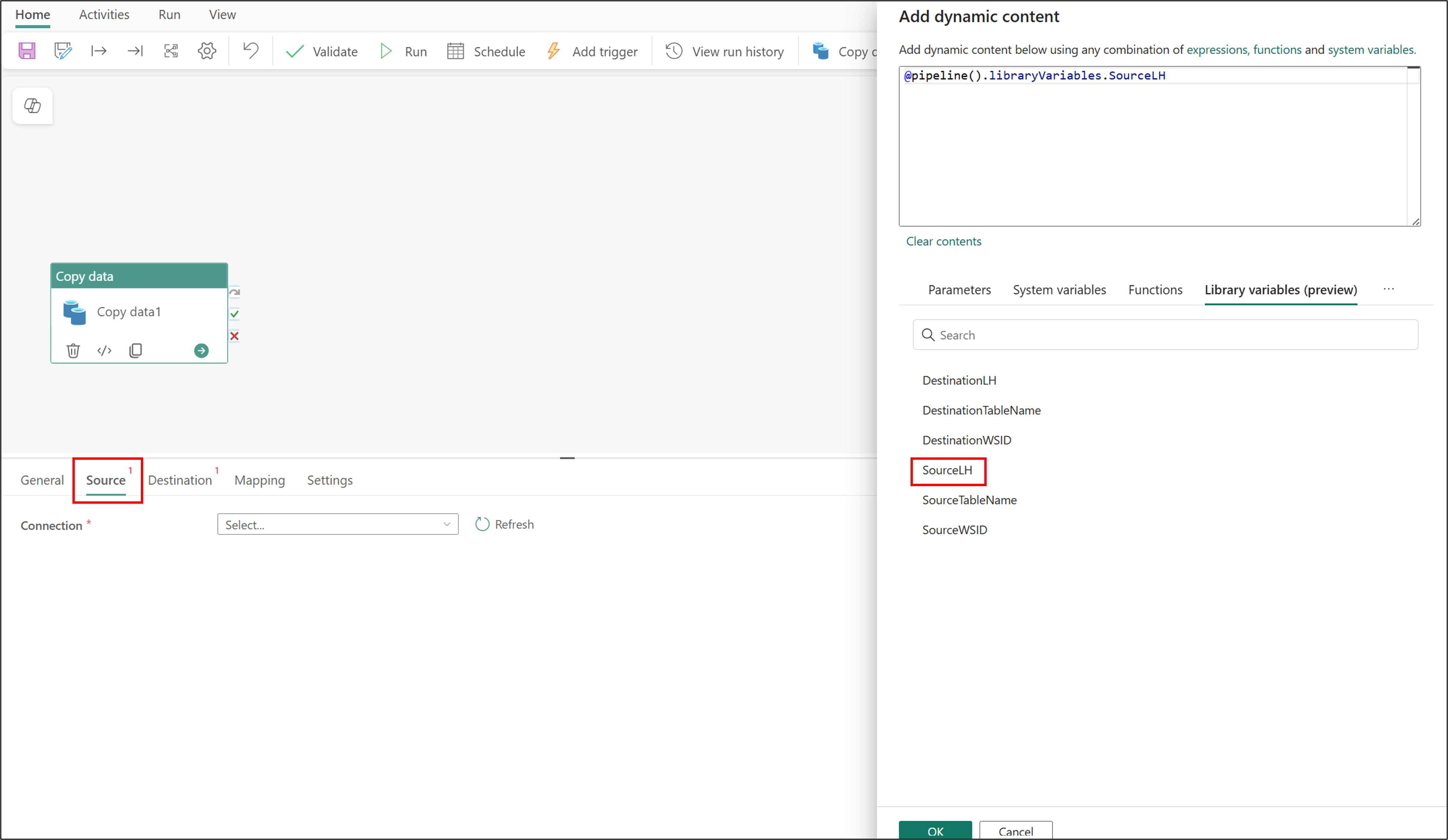 @pipeline().libraryVariables.SourceTableName. Selecciona Aceptar.