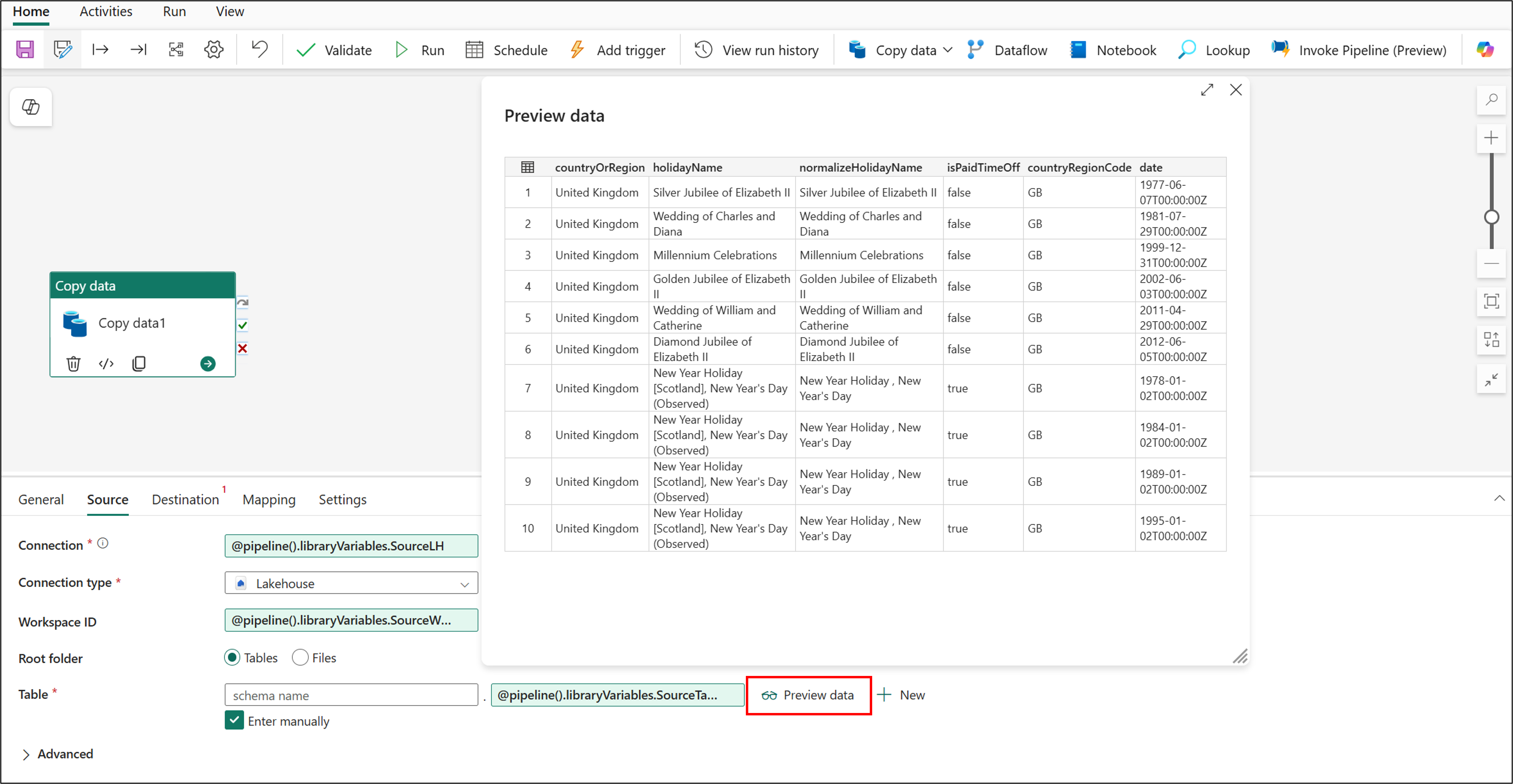 En este tutorial se muestra cómo usar contenido dinámico en canalizaciones de Microsoft Fabric. Al crear un elemento de biblioteca de variables y agregar variables a él, puede automatizar los valores de varias fases de la canalización de implementación. En este tutorial, copiará datos de una instancia de Lakehouse a otra. A continuación, use la biblioteca de variables para establecer los valores de origen y destino de la actividad de copia.